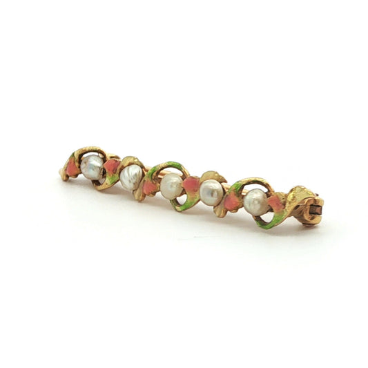 1890 Art Nouveau 14k Yellow Gold Pearl & Enamel Flower Brooch