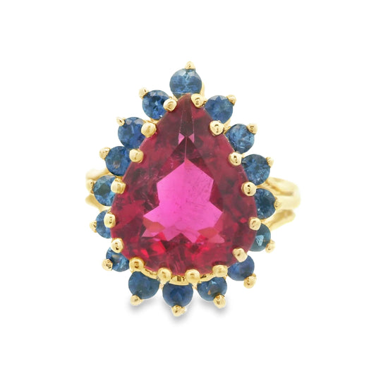 1980s 14K Yellow Gold Reddish Pink Tourmaline and Natural Blue Sapphire Ring