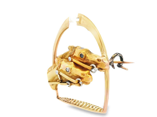 Late Victorian 14k Yellow Gold and Diamond Horse + Stirrup Pin